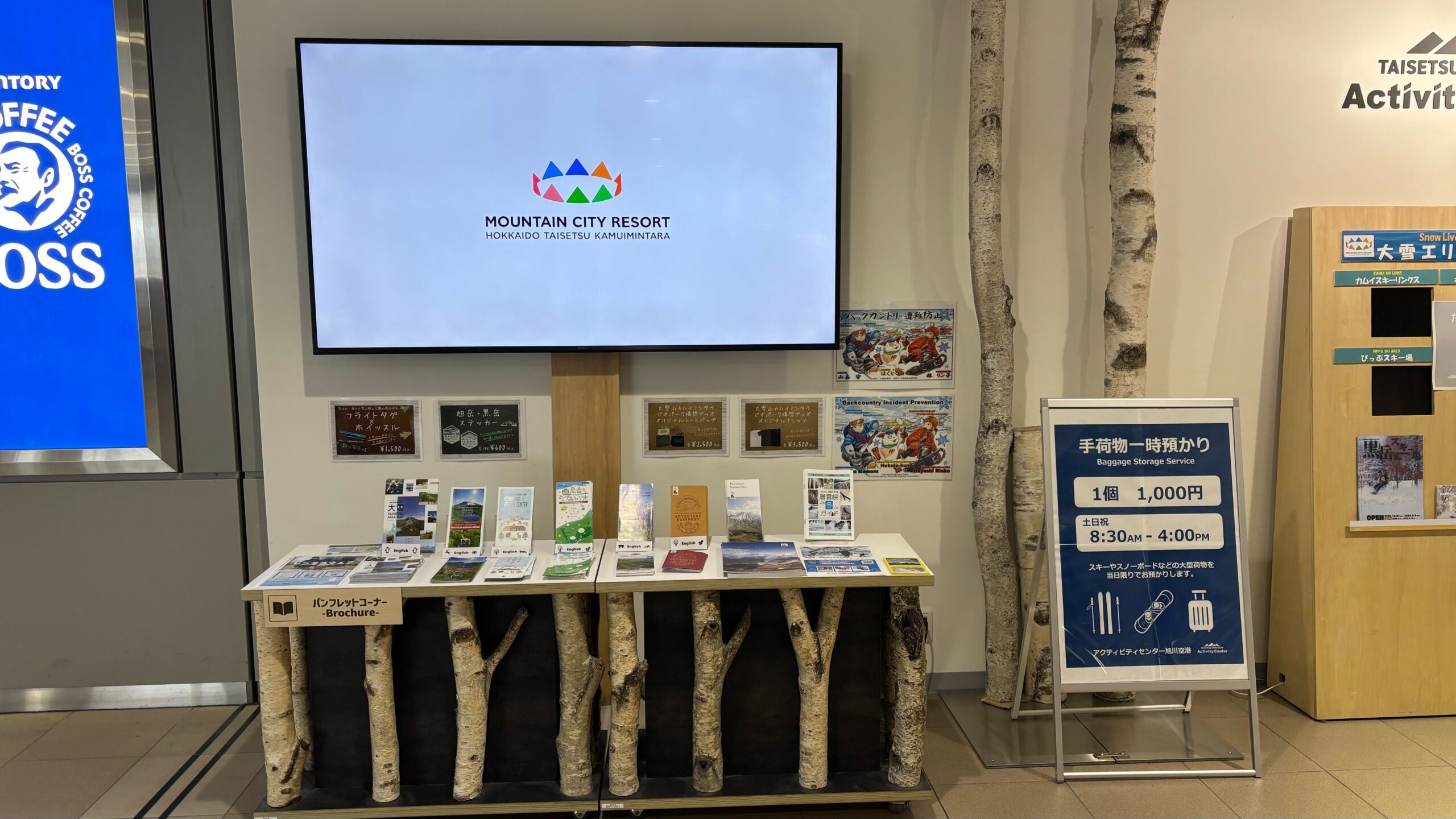 観光情報が満載: 旭川大雪エリアの観光パンフレットが複数設置されており、旅の計画を立てるのに役立ちます。
