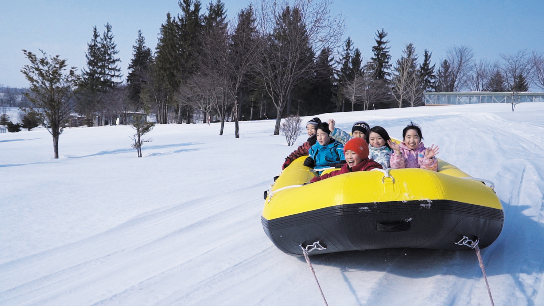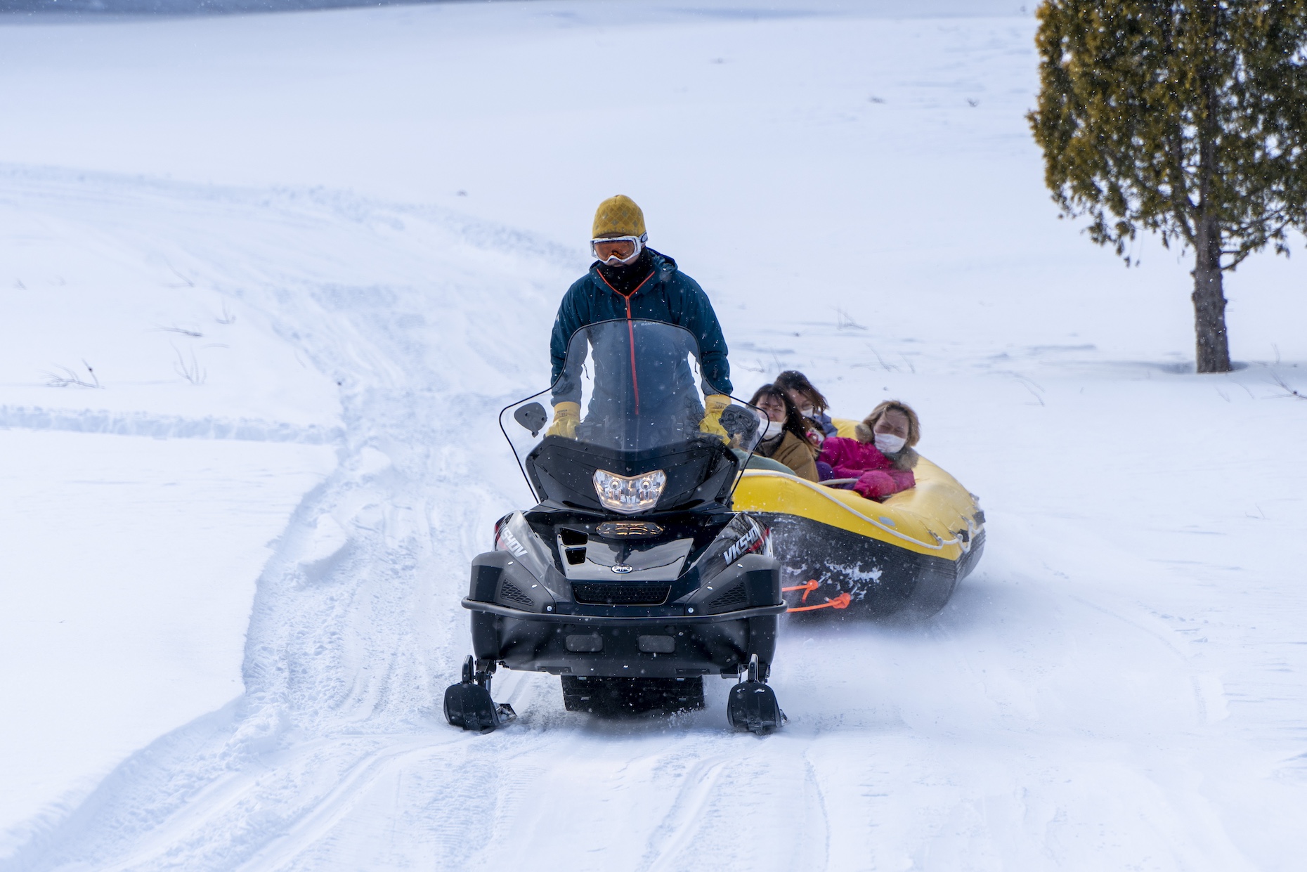 スノーモービルに牽引されたラフティングボートに乗って、専用コースを滑走!全長約800m~900mのコースをアップダウンしながら雪上を駆け抜けます。雪しぶきを上げながら滑走するスピード感は、まさに冬の絶叫アクティビティです!小さいお子様向けの安心コースも用意されています。