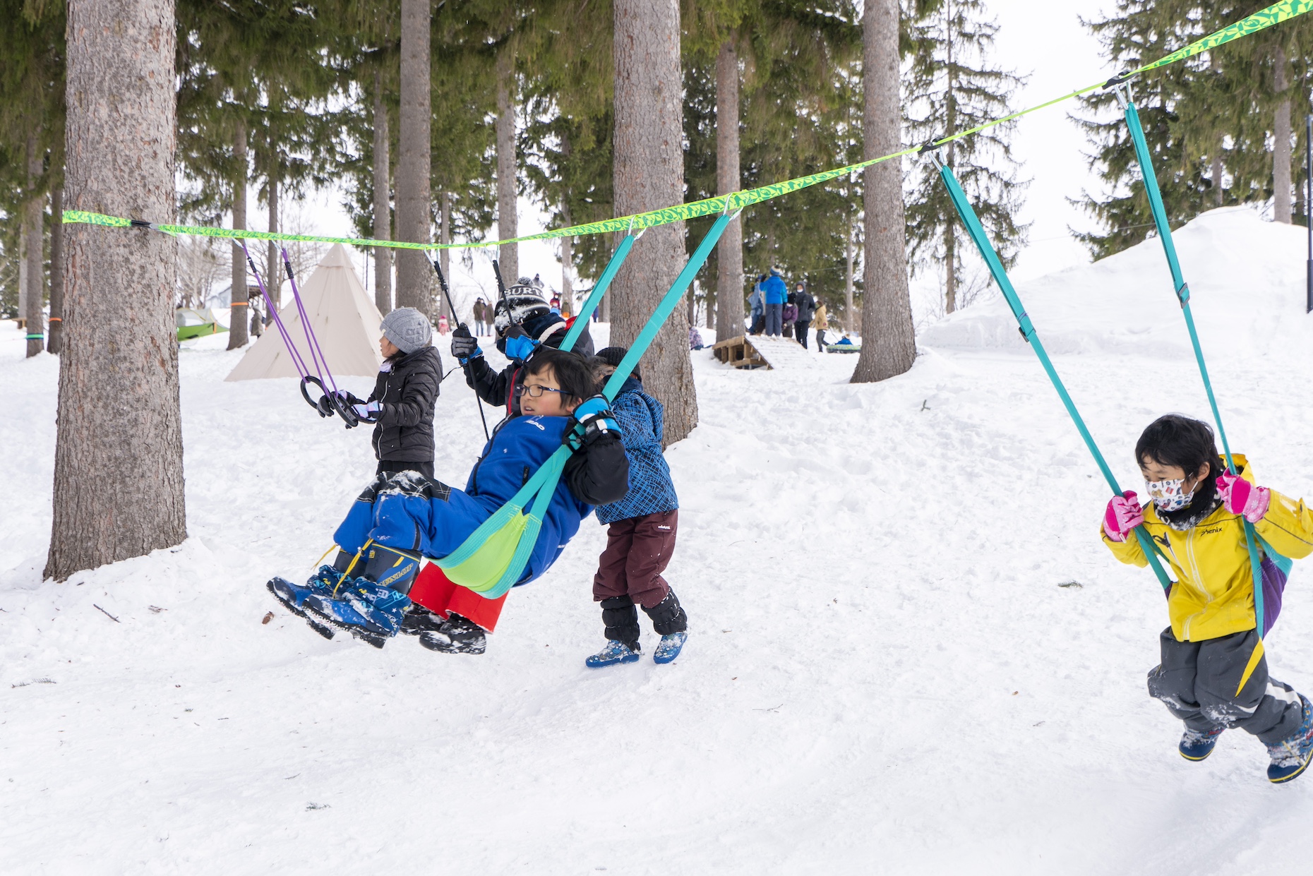 🌲 林間雪遊び広場:ジップラインや、おしゃれなハンモックなどが設置されており、ゆっくりとした時間を過ごせます。